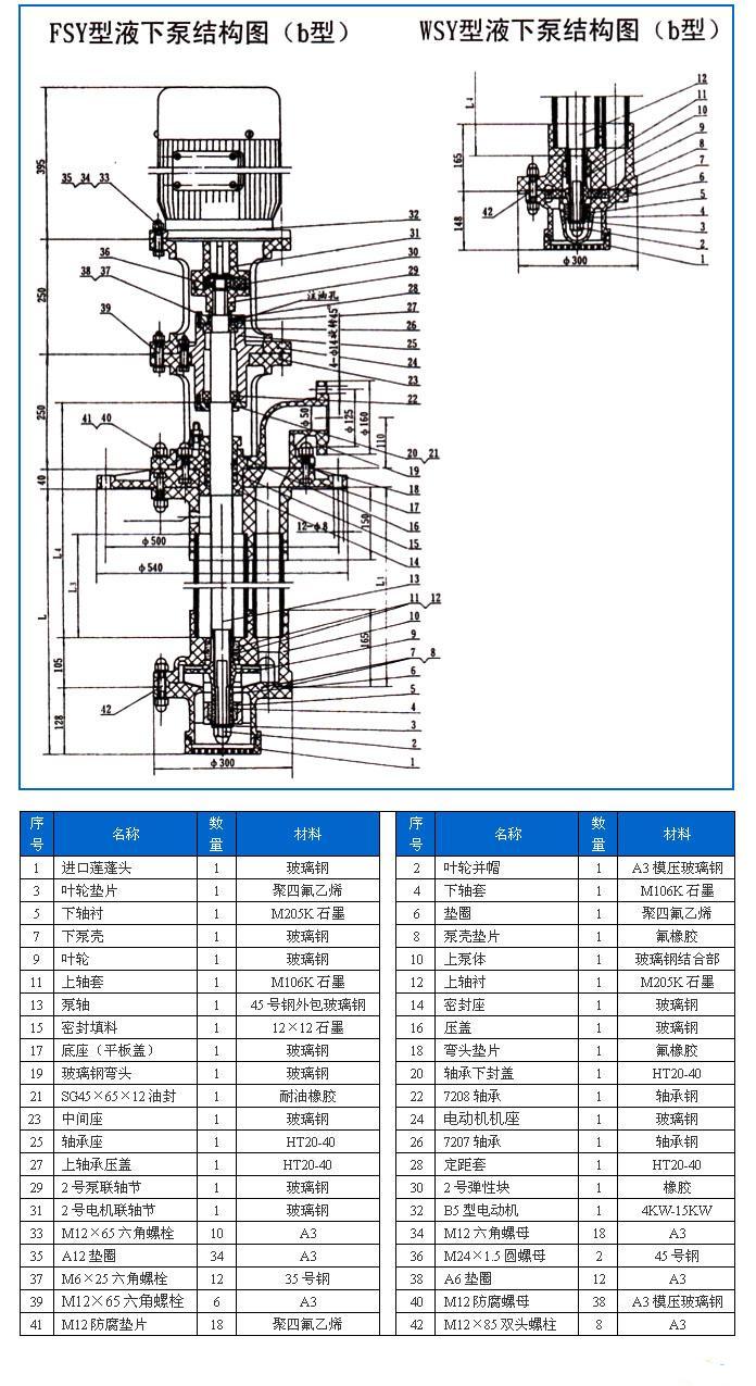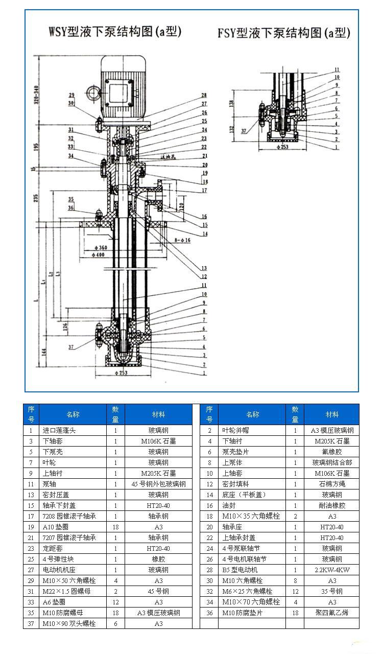 FSY型、WSY型立式玻璃鋼液下泵為本單位生產的WSY型、FSY型兩種型式的泵,1.WSY型立式玻璃鋼液下旋渦泵。2.FSY型立式玻璃鋼液下離心泵,FSY型、WSY型立式玻璃鋼液下泵因伸入貯罐,貯槽的深度長短不同,設計液下深度800mm--3000mm之間任意選擇。FSY型、WSY型立式玻璃鋼液下泵只要液體高于泵體,即可不灌液而起動送液,平蓋板下設有泄漏孔,液體不會向貯罐外泄漏。